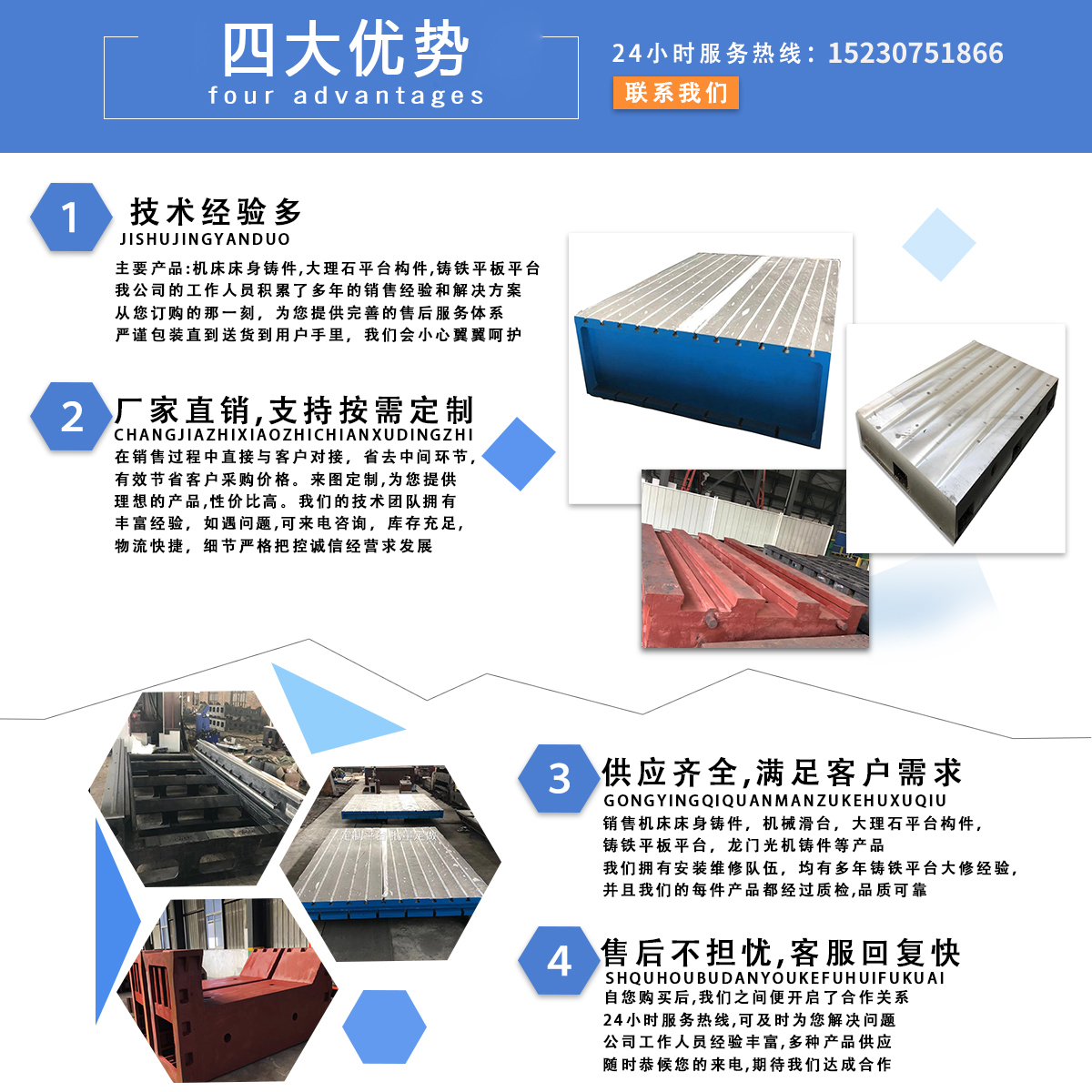 等產(chǎn)品。為了方便用戶(hù),可根據(jù)客戶(hù)要求加工訂做各種非標(biāo)準(zhǔn)量具,并承接樹(shù)脂砂鑄造。機(jī)床廠(chǎng)的床身、立柱、橫梁、工作臺(tái)、變速箱體鑄件業(yè)務(wù)和機(jī)械加工業(yè)務(wù)等等。我公司企業(yè)宗旨以“技術(shù)規(guī)范,產(chǎn)品實(shí)用”為核心,可以根據(jù)客戶(hù)要求支持定制,公司具有完善的質(zhì)量_體系,產(chǎn)品具有設(shè)計(jì)合理,結(jié)構(gòu)穩(wěn)定,使用壽命長(zhǎng)等特點(diǎn),堅(jiān)決以為客戶(hù)服務(wù)為中心!實(shí)實(shí)在在做人,踏踏實(shí)實(shí)做事!